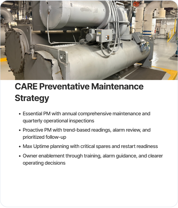 Preventative maintenance leads the commercial story because it speaks directly to uptime, lifecycle cost, and operating confidence. CCMS uses vintage matched OEM methods, trends readings across visits, reviews alarms and operating history, and prioritizes corrective follow-up before failures become shutdowns