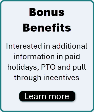 We offer paid holidays, PTO, and a pull through incentive plan. Enter your name and mobile number and we will text you the details.